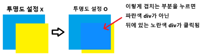 div2에 opacity를 주면 div2의 z-index가 0으로 임의지정되어 뒤에 있는 div1이 앞으로 튀어나온다는 것이다.
